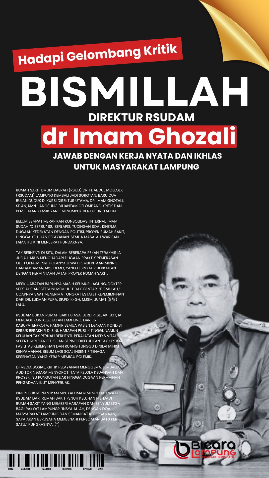 BICARALAMPUNG– Rumah Sakit Umum Daerah (RSUD) Dr. H. Abdul Moeloek (RSUDAM) Lampung kembali jadi sorotan. Baru dua bulan duduk di kursi direktur utama, dr. Imam Ghozali, Sp.An, KMN, langsung dihantam gelombang kritik dan persoalan klasik yang menumpuk bertahun-tahun.
