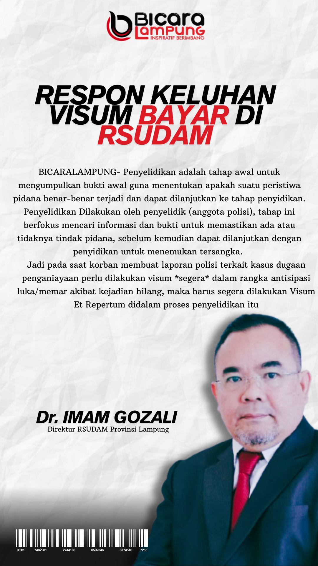 Dan untuk legal standing / dasar hukum pemungutan biaya untuk Visum Et Repertum itu diatur didalam Peraturan Gubernur Nomor 18 tahun 2023 tentang tarif pelayanan kesehatan rumah sakit umum daerag Dr. H. Abdul Moeloek Provinsi Lampung