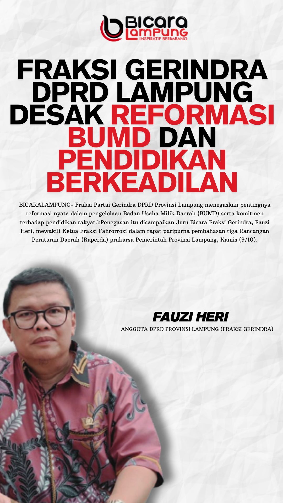 BICARALAMPUNG– Fraksi Partai Gerindra DPRD Provinsi Lampung menegaskan pentingnya reformasi nyata dalam pengelolaan Badan Usaha Milik Daerah (BUMD) serta komitmen terhadap pendidikan rakyat.