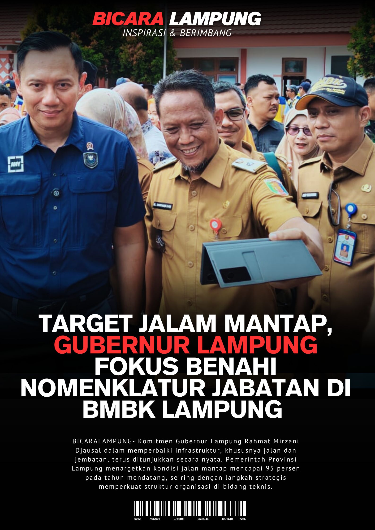 BICARALAMPUNG – Komitmen Gubernur Lampung Rahmat Mirzani Djausal dalam memperbaiki infrastruktur, khususnya jalan dan jembatan, terus ditunjukkan secara nyata. Pemerintah Provinsi Lampung menargetkan kondisi jalan mantap mencapai 95 persen pada tahun mendatang, seiring dengan langkah strategis memperkuat struktur organisasi di bidang teknis.