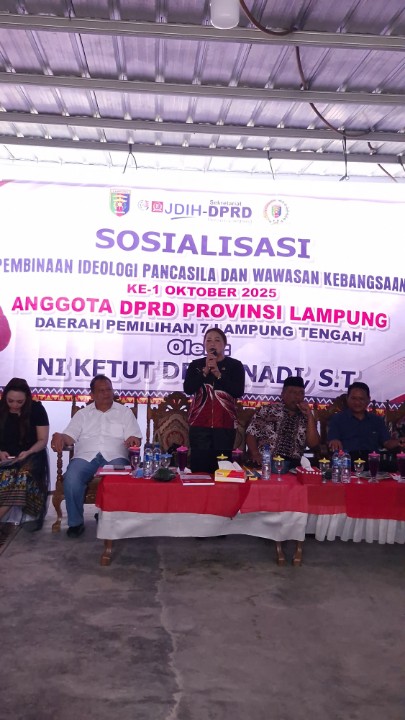 BICARALAMPUNG– Anggota DPRD Provinsi Lampung, Ni Ketut Dewi Nadi, menegaskan pentingnya menghidupkan kembali semangat gotong royong sebagai roh Pancasila dalam memperkuat persatuan dan pembangunan bangsa. Hal itu ia sampaikan dalam kegiatan Sosialisasi Pembinaan Ideologi Pancasila dan Wawasan Kebangsaan yang digelar di Kampung Sido Binangun (SB 9), Kecamatan Way Seputih, Kabupaten Lampung Tengah, Minggu (12/10).