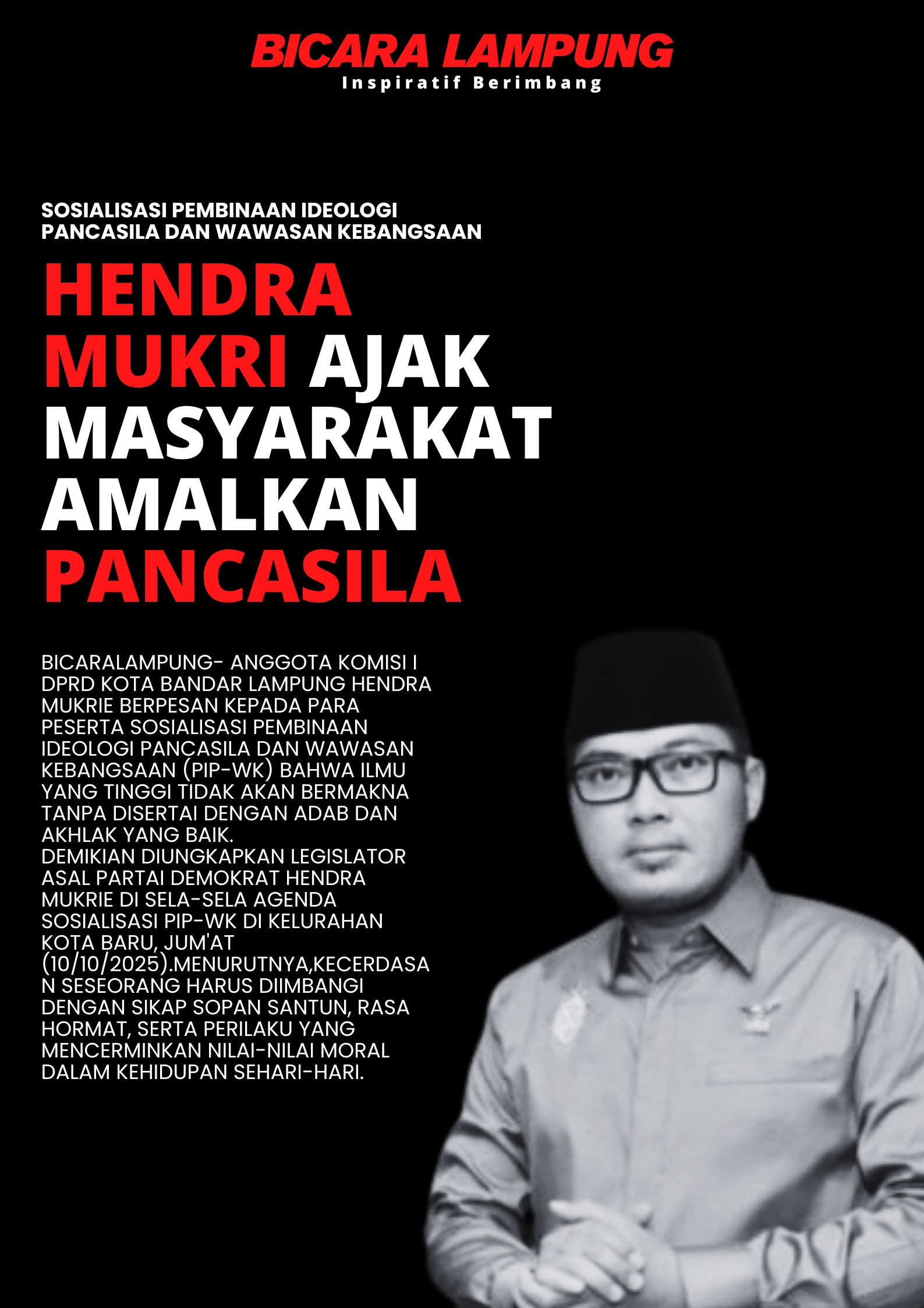 BICARALAMPUNG– Anggota Komisi I DPRD Kota Bandar Lampung Hendra Mukrie berpesan kepada para peserta Sosialisasi Pembinaan Ideologi Pancasila dan Wawasan Kebangsaan (PIP-WK) bahwa ilmu yang tinggi tidak akan bermakna tanpa disertai dengan adab dan akhlak yang baik.