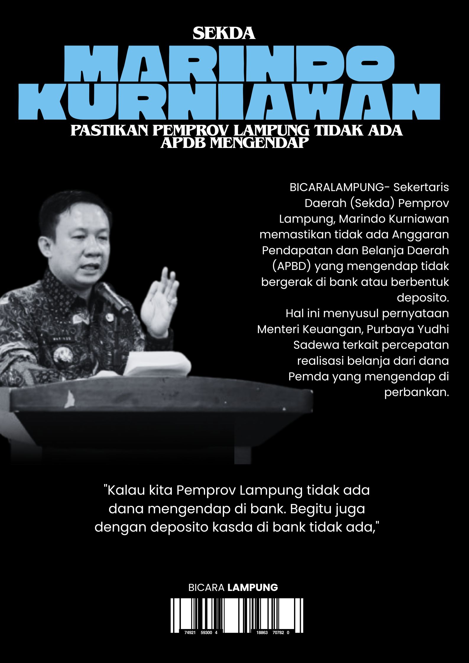 BICARALAMPUNG– Sekertaris Daerah (Sekda) Pemprov Lampung, Marindo Kurniawan memastikan tidak ada Anggaran Pendapatan dan Belanja Daerah (APBD) yang mengendap tidak bergerak di bank atau berbentuk deposito.