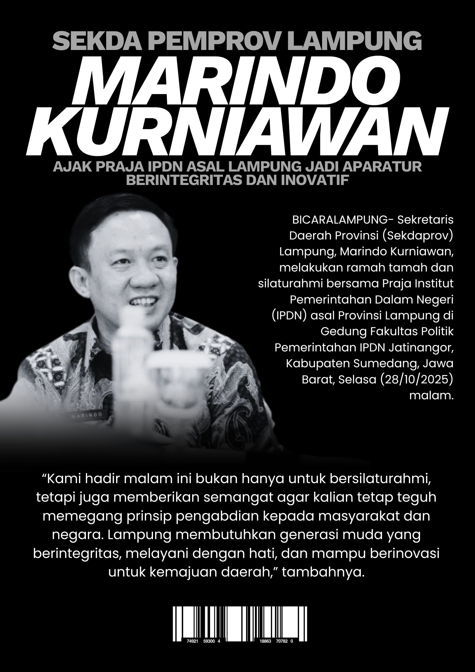 “Kesempatan ini menjadi ajang silaturahmi yang berharga sekaligus bentuk motivasi bagi adik-adik praja asal Lampung. Kalian adalah aset berharga daerah, calon-calon pemimpin masa depan yang akan meneruskan estafet pemerintahan dan pembangunan di tanah kelahiran kita,” ujar Marindo.