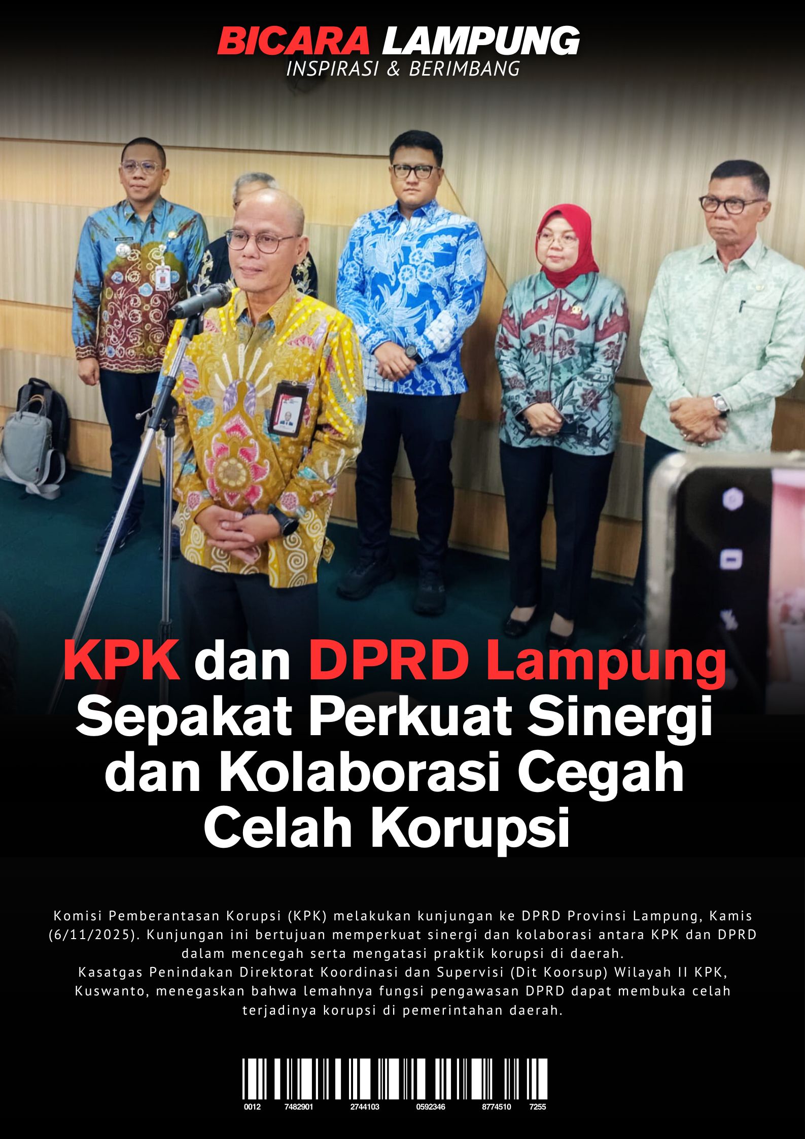 BICARALAMPUNG– Komisi Pemberantasan Korupsi (KPK) melakukan kunjungan ke DPRD Provinsi Lampung, Kamis (6/11/2025). Kunjungan ini bertujuan memperkuat sinergi dan kolaborasi antara KPK dan DPRD dalam mencegah serta mengatasi praktik korupsi di daerah.