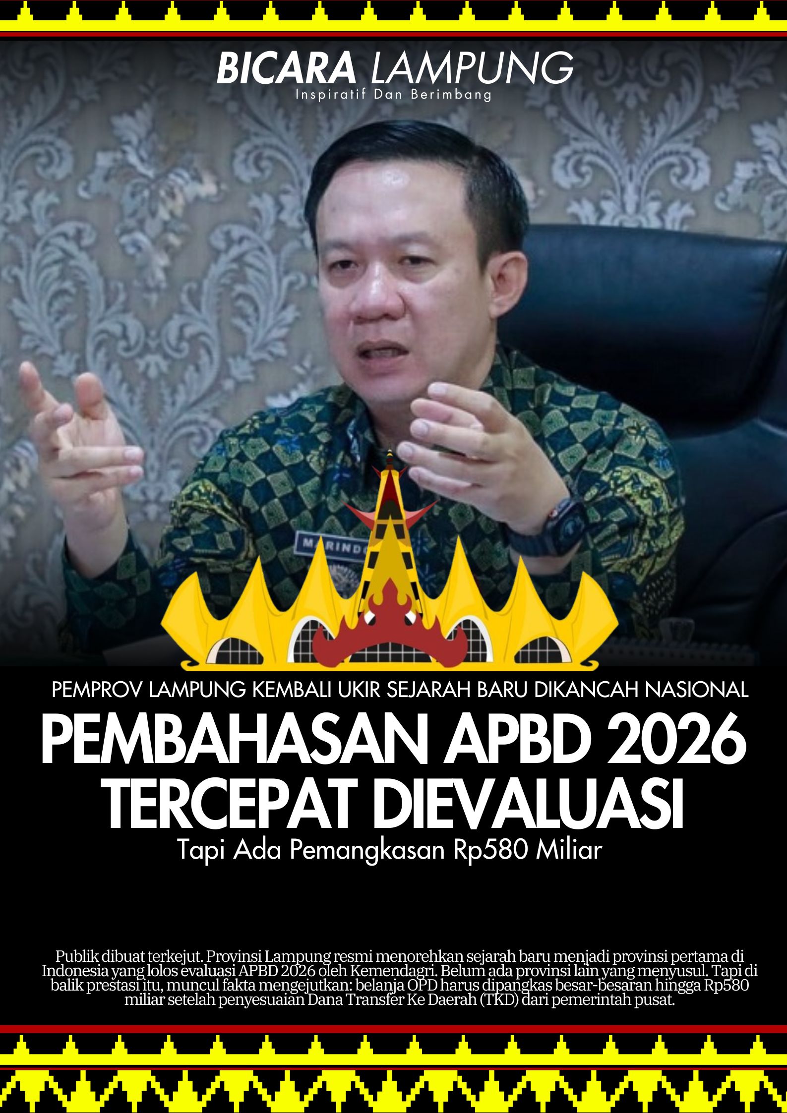 BICARALAMPUNG– Publik dibuat terkejut. Provinsi Lampung resmi menorehkan sejarah baru menjadi provinsi pertama di Indonesia yang lolos evaluasi APBD 2026 oleh Kemendagri. Belum ada provinsi lain yang menyusul.