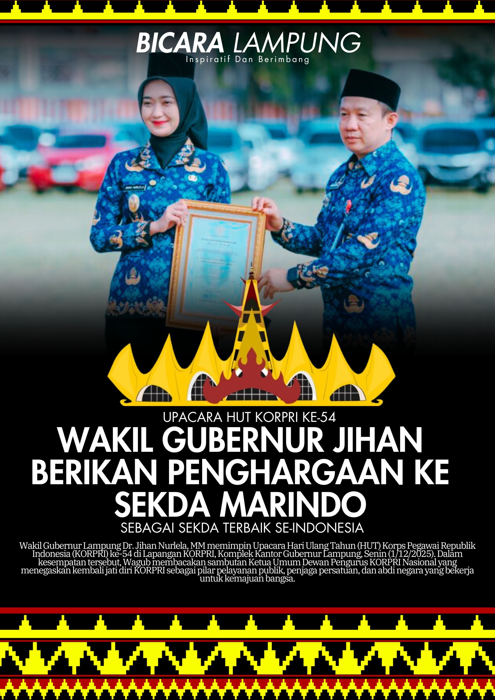Usai pembacaan sambutan, rangkaian kegiatan dilanjutkan dengan penyerahan Piagam Penghargaan dari Gubernur Lampung yang diserahkan langsung oleh Wakil Gubernur Jihan Nurlela kepada Sekretaris Daerah Provinsi Lampung, Dr. Marindo Kurniawan, S.T., M.M.