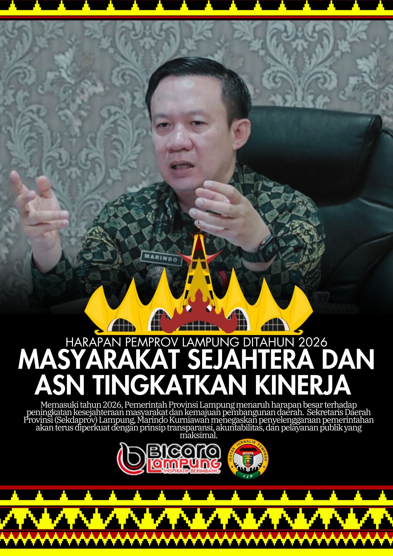 Sekretaris Daerah Provinsi (Sekdaprov) Lampung, Marindo Kurniawan menegaskan penyelenggaraan pemerintahan akan terus diperkuat dengan prinsip transparansi, akuntabilitas, dan pelayanan publik yang maksimal.