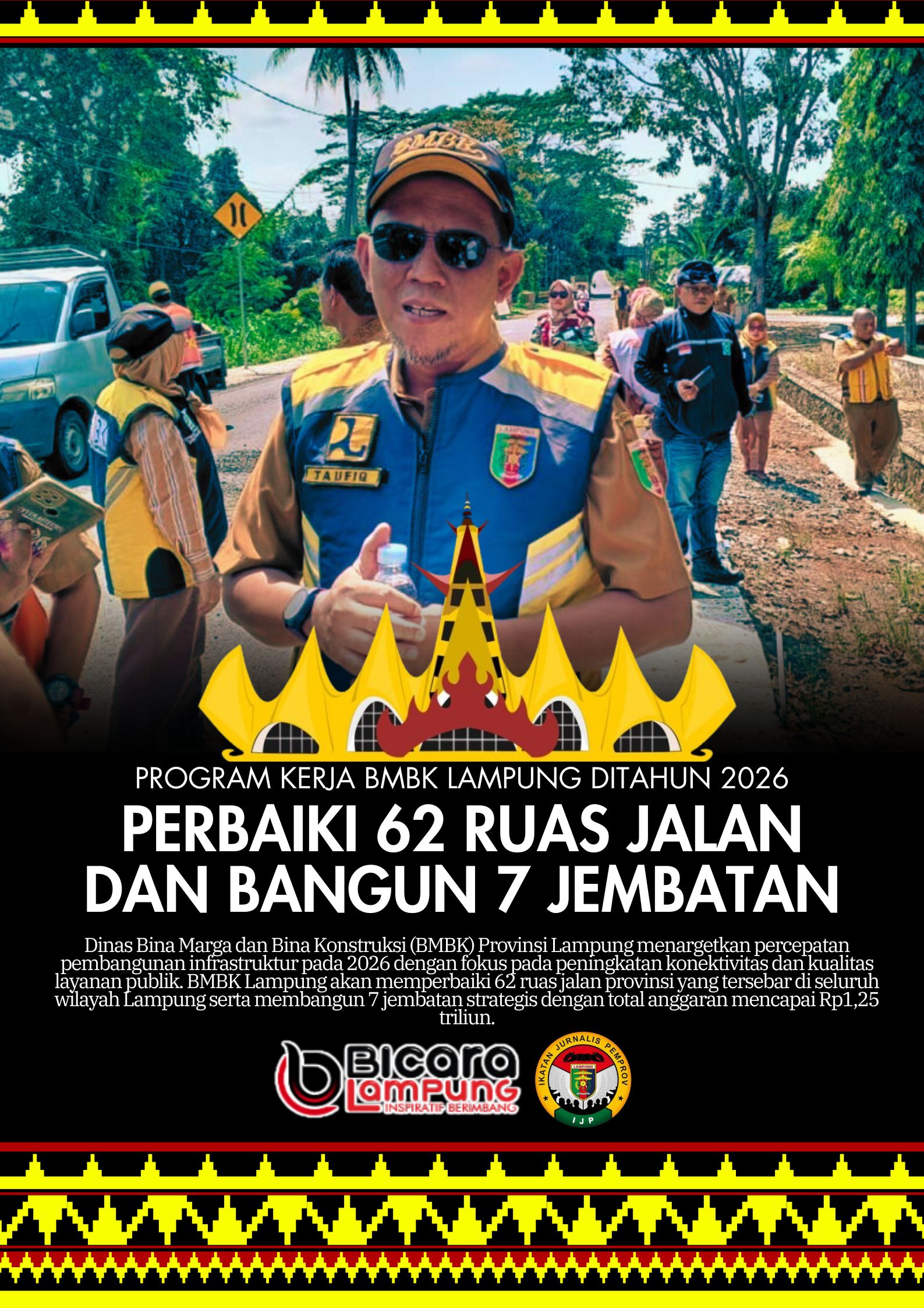 BICARALAMPUNG– Dinas Bina Marga dan Bina Konstruksi (BMBK) Provinsi Lampung menargetkan percepatan pembangunan infrastruktur pada 2026 dengan fokus pada peningkatan konektivitas dan kualitas layanan publik. BMBK Lampung akan memperbaiki 62 ruas jalan provinsi yang tersebar di seluruh wilayah Lampung serta membangun 7 jembatan strategis dengan total anggaran mencapai Rp1,25 triliun.