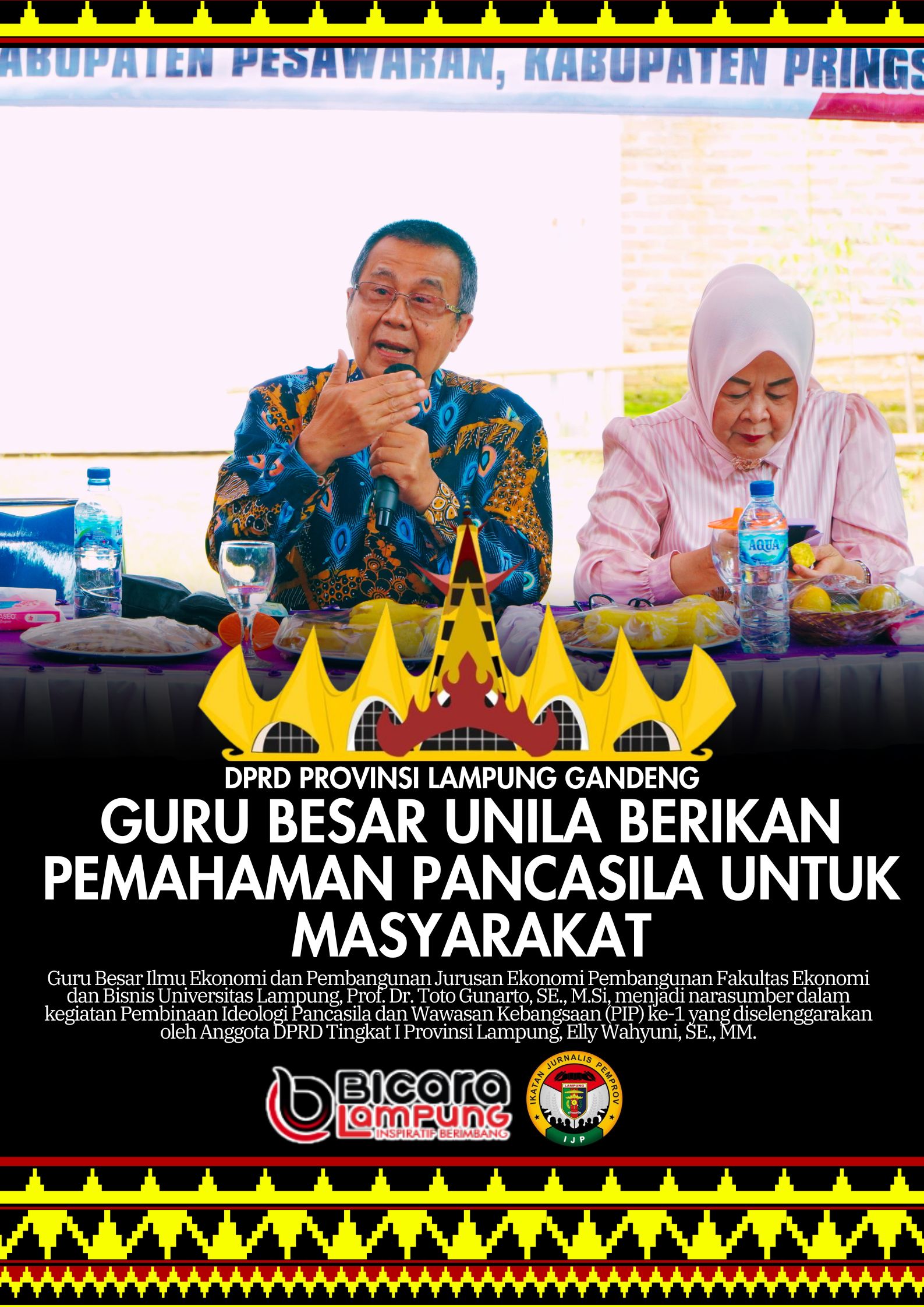 BICARALAMPUNG– Guru Besar Ilmu Ekonomi dan Pembangunan Jurusan Ekonomi Pembangunan Fakultas Ekonomi dan Bisnis Universitas Lampung, Prof. Dr. Toto Gunarto, SE., M.Si, menjadi narasumber dalam kegiatan Pembinaan Ideologi Pancasila dan Wawasan Kebangsaan (PIP) ke-1 yang diselenggarakan oleh Anggota DPRD Tingkat I Provinsi Lampung, Elly Wahyuni, SE., MM.