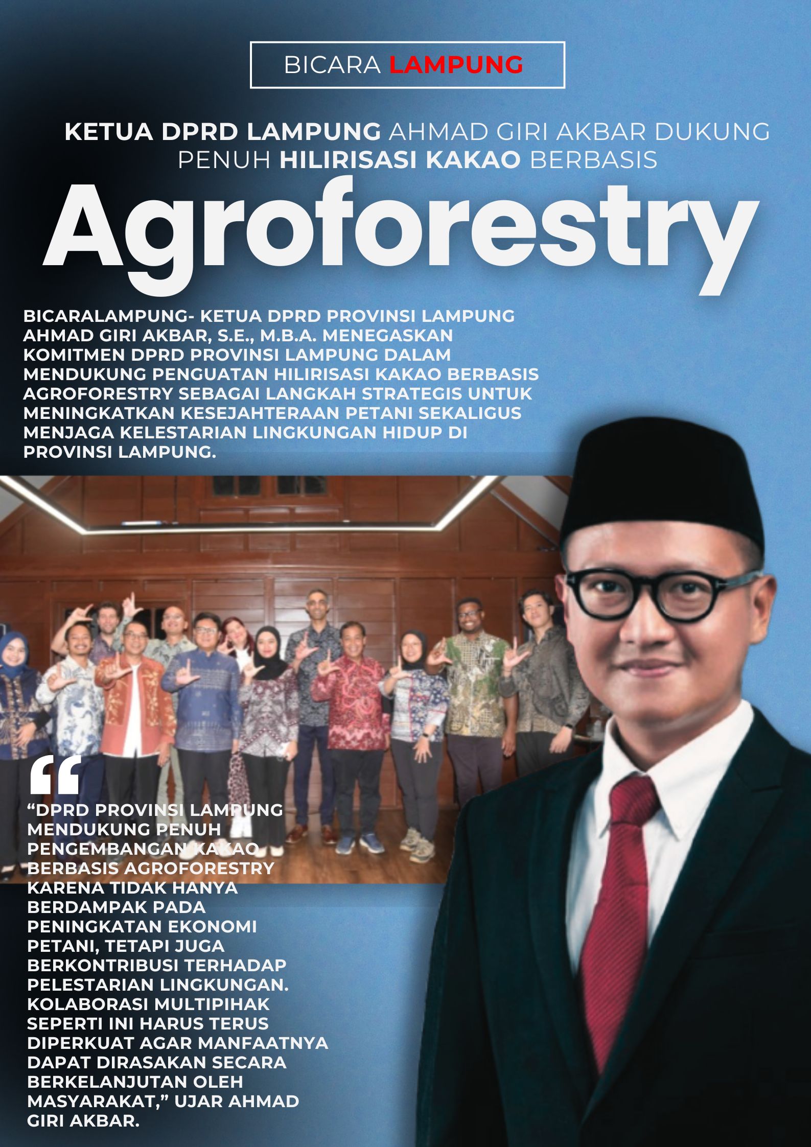 BICARALAMPUNG– Ketua DPRD Provinsi Lampung Ahmad Giri Akbar, S.E., M.B.A. menegaskan komitmen DPRD Provinsi Lampung dalam mendukung penguatan hilirisasi kakao berbasis agroforestry sebagai langkah strategis untuk meningkatkan kesejahteraan petani sekaligus menjaga kelestarian lingkungan hidup di Provinsi Lampung.