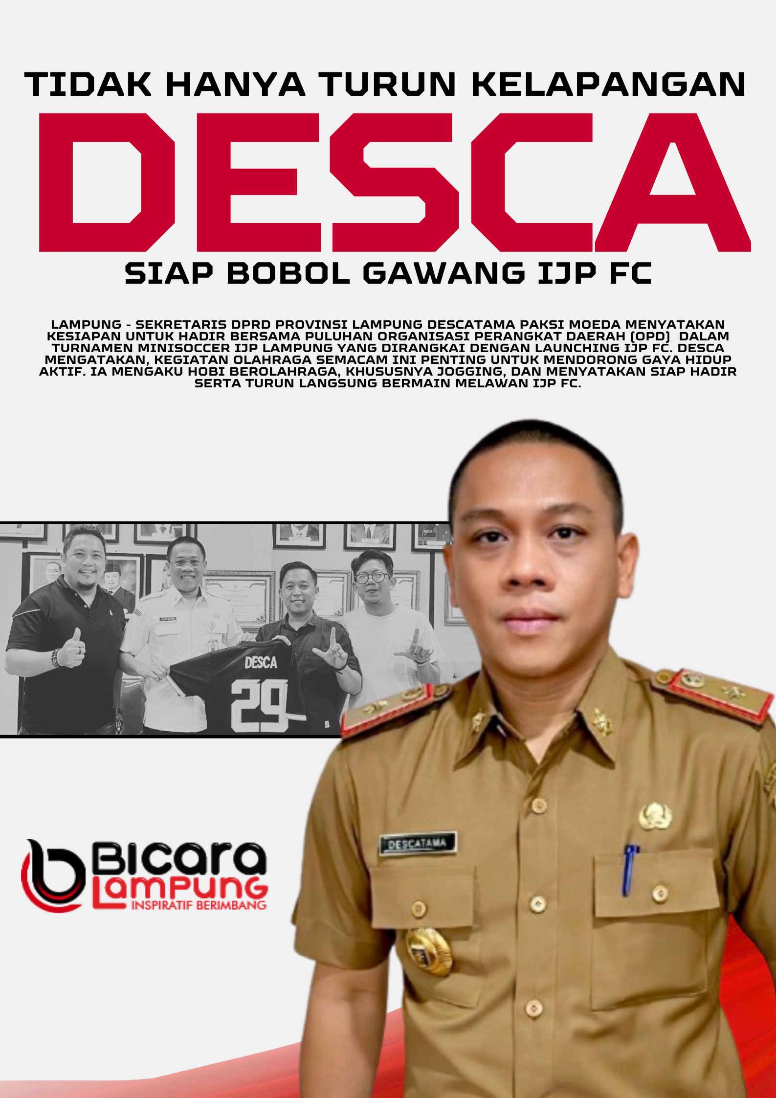 BICARALAMPUNG – Sekretaris DPRD Provinsi Lampung Descatama Paksi Moeda menyatakan kesiapan untuk hadir bersama puluhan Organisasi Perangkat Daerah (OPD) dalam turnamen minisoccer IJP Lampung yang dirangkai dengan launching IJP FC.