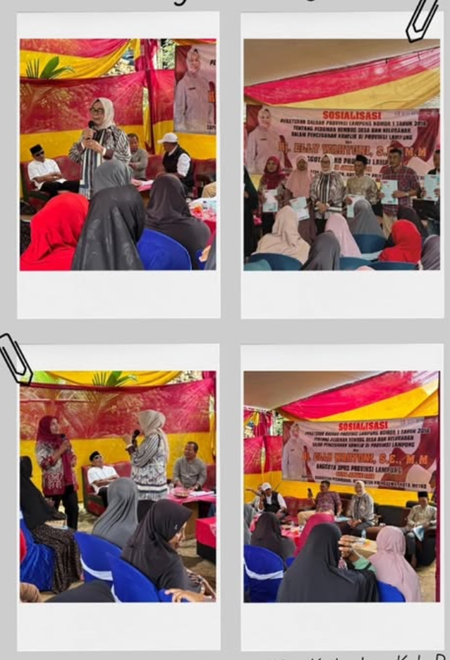 BICARALAMPUNG- Sekretaris Komisi V DPRD Provinsi Lampung, Elly Wahyuni, menggelar Sosialisasi Peraturan Daerah (Sosper) Perda Nomor 1 Tahun 2016 tentang Pedoman Rembug Desa dan Kelurahan dalam Pencegahan Konflik di Provinsi Lampung, Sabtu (24/1).